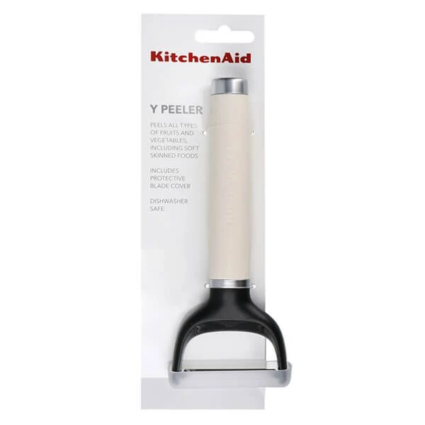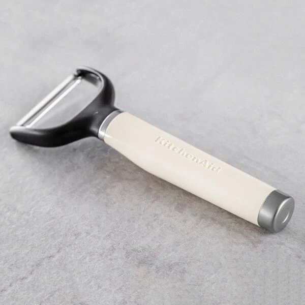 Crafted from premium grade materials, this KitchenAid Stainless Steel Y Peeler in Almond Cream features a single-edge straight blade that quickly peel fruit and vegetables. The glossy handle includes a debossed logo and a satin chrome-plated bolster.