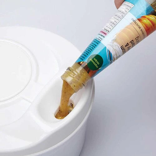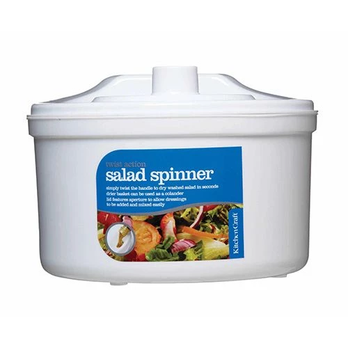 Twist action salad spinner with enclosed drying basket, for quick and easy drying preparation of washed salad. Features an aperture for adding salad dressing whilst spinning to evenly coat throughout the salad ready for serving.