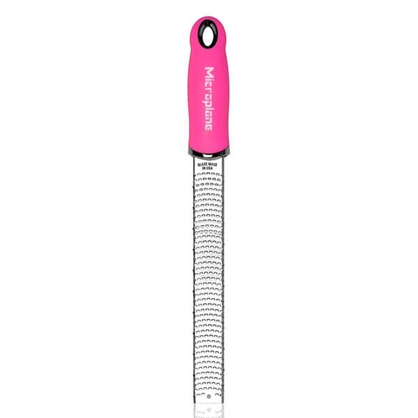 This Microplane NEON pink premium zester has a photo-etched stainless steel blade for ultra sharp and long lasting performance when zesting citrus fruits.