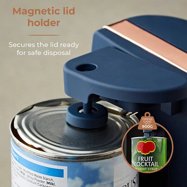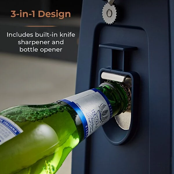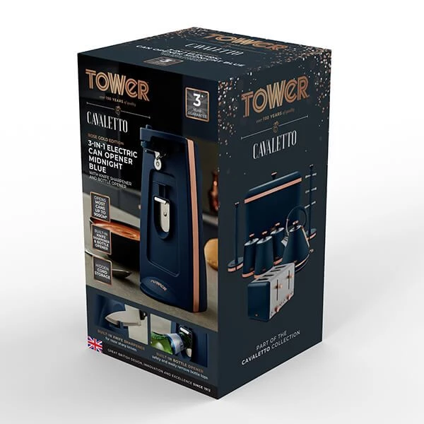 Make daily meal prep even easier using the multi-functional Tower Cavaletto Electric Can Opener. Finished in classic Cavaletto midnight blue with rose gold accents, this 3-in-1 electric can opener features a built-in knife sharpener and bottle opener.