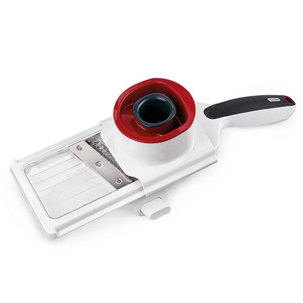 The Zyliss handheld slicer features a high-grade serrated steel blade that is ideal for producing uniform slices and with the press of a button will switch to julienne slices. The slicer can also adjust the thickness of each slice with safe slicing using the food holder to protect your hands during use. The food holder is on tracks for extra safely and avoids slipping whilst slicing.